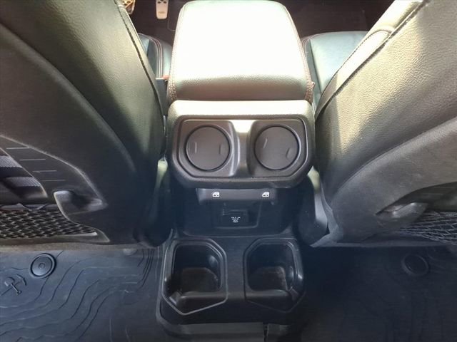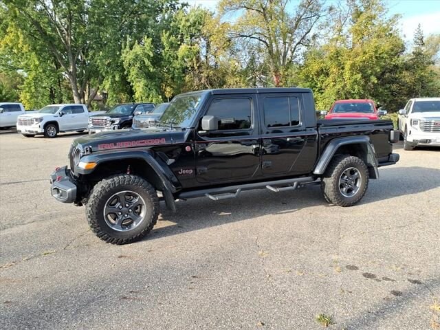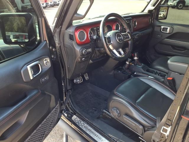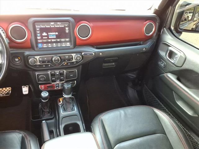 2020 JEEP GLADIATOR RUBICON 4X4 FEATURES LEATHER-TRIMMED BUCKET SEATS, HEATED FRONT SEATS, HEATED STEERING WHEEL, REMOTE START, UCONNECT 8.4-INCH NAVIGATION SYSTEM, ALPINE PREMIUM AUDIO, AND LOCKABLE REAR UNDERSEAT STORAGE. SAFETY TECHNOLOGY INCLUDES BLIND-SPOT DETECTION, CROSS-PATH DETECTION, ADAPTIVE CRUISE CONTROL, FORWARD COLLISION WARNING PLUS, PARKVIEW REAR CAMERA, AND ADVANCED BRAKE ASSIST. EXTERIOR UPGRADES INCLUDE PREMIUM LED LIGHTING, BODY-COLOR FENDER FLARES, SPRAY-IN BEDLINER, FREEDOM TOP 3-PIECE HARD TOP WITH SLIDING REAR WINDOW, ROLL-UP TONNEAU COVER, TRAILER-TOW PACKAGE, AND 33-INCH ALL-TERRAIN TIRES WITH FOX PERFORMANCE SHOCKS.